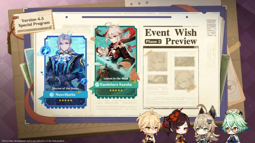 Durante la segunda mitad de la versión los personajes presentes en los banners promocionales serán Neuvillette (Hydro) y Kazuha (Anemo). Durante toda la versión también se estrenará un tercer banner de gachapón recopilatorio con la inclusión de personajes célebres como Albedo, Eula, Mona, Klee, Diluc y Jean. Este nuevo Banner no solo se limita a los personajes, sino que también presenta más de 10 armas de cinco estrellas, entre las que se encuentran la Lápida del Lobo y la Senda de la Cazadora.
